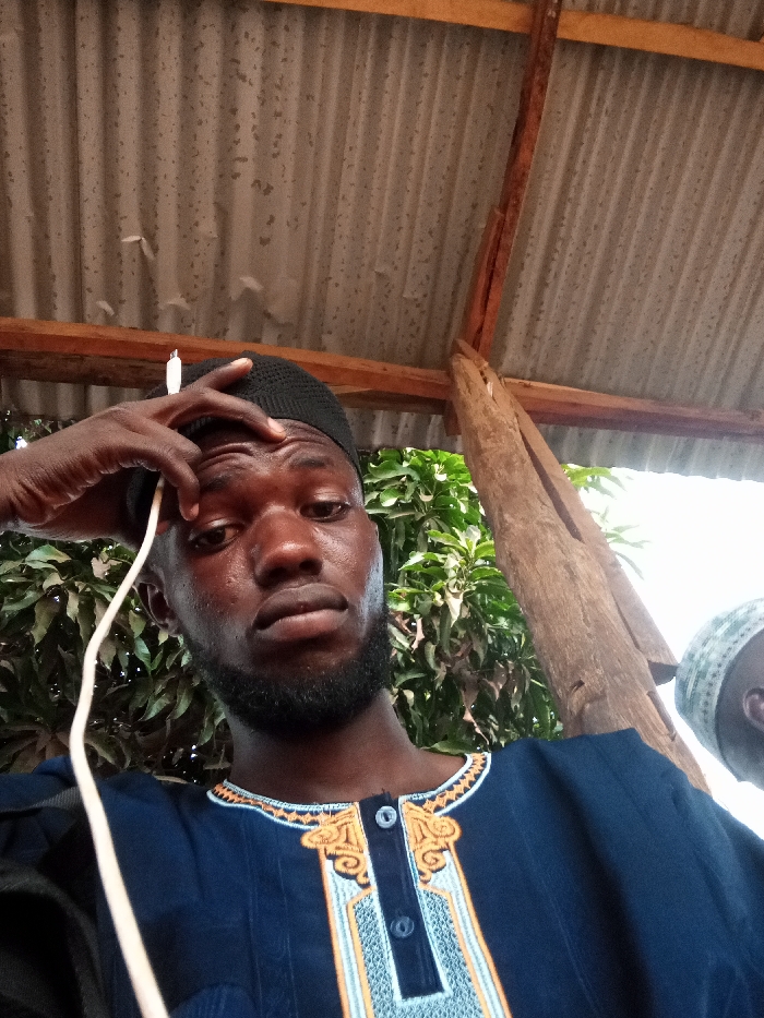 A dark-skinned man with a beard wears a black knitted cap and a dark blue shirt with decorative embroidery around the collar. He holds a white phone charging cable to his forehead. Over his head, there is a corrugated metal roof supported by wooden beams. Green foliage is visible in the background. Another person wearing a patterned cap is partially visible in the lower right corner.