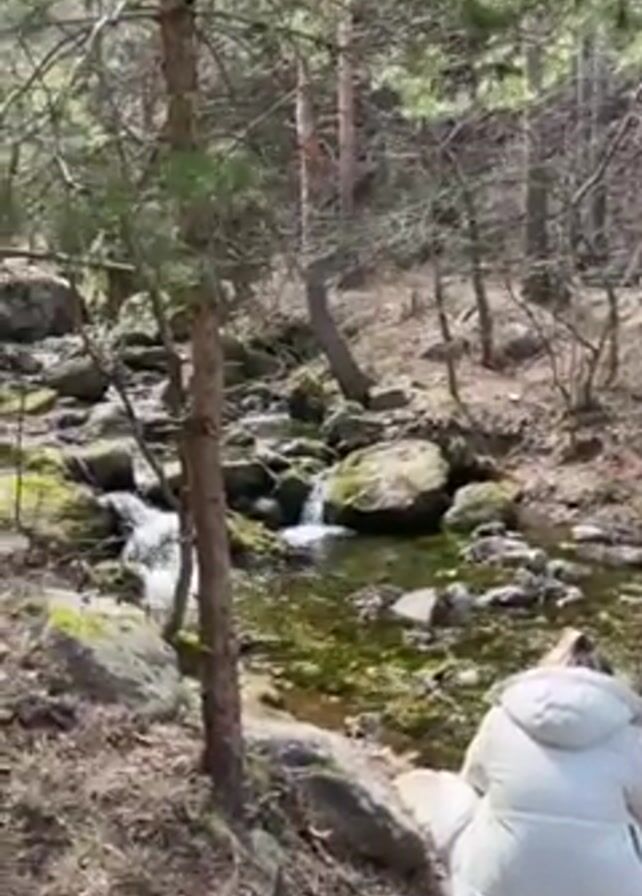 A person in a white jacket crouches beside a stream in a forest. The stream flows over rocks, some of which are covered in moss. The forest is composed of trees with thin trunks and sparse foliage. The ground is covered in dry leaves and pine needles. The lighting suggests a sunny day, but the overall atmosphere is peaceful and serene. The camera angle is slightly elevated, providing a clear view of the stream and the surrounding woodland.
