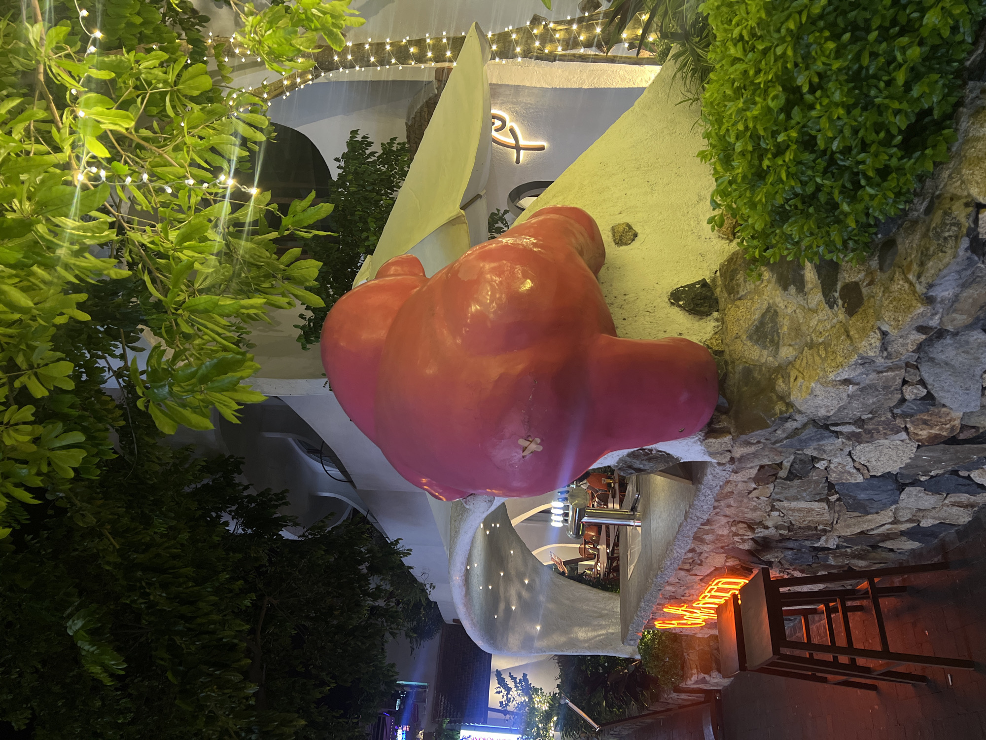 The image displays an illuminated outdoor bar and dining area at night in Nha Trang, Vietnam. In the central foreground, a large, abstract, plump pink sculpture, possibly depicting a stylized animal or figure, rests atop a low wall constructed from irregular grey and brown stones. A repair patch resembling an "X" mark is visible on the sculpture's upper right side. Below the stone wall, a red neon sign partially spells "Cafe Beer," and two dark-toned wooden bar stools are positioned on the ground. The wall's upper surface forms a grey counter, on which a multi-tap stainless steel beer dispensing system is installed. Behind this counter and sculpture, a building with distinctive white, curvilinear, and organic architectural elements features arched openings. Within these arches, individuals are vaguely visible seated at tables, suggesting a dining area. Recessed lighting illuminates the interior of these arched structures. To the right, on the building's white facade, a glowing white "f" logo is affixed beneath a light-colored awning. The surrounding environment includes lush green foliage from trees and bushes. A prominent tree on the right is heavily wrapped with white string lights, and additional string lights are visible hanging from branches in the upper section of the frame. Spotlights illuminate portions of the building and vegetation, contributing to the bright nighttime setting.