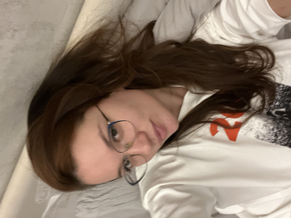 - "A woman with brown hair and glasses lies down on a bed with white sheets" by FM-Dx6k82, licensed under CC BY 4.0