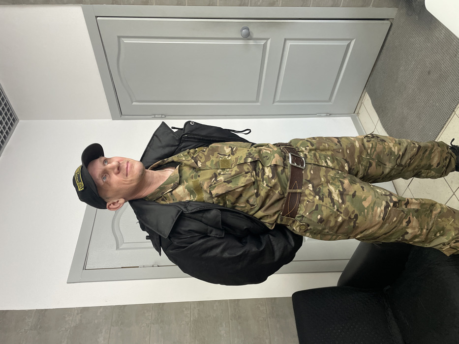 An adult male subject is depicted standing indoors in Izhevsk, Russia. The man, appearing to be in his late 40s to early 50s, possesses a fair complexion and light-colored eyes, directed towards the right side of the frame. He is dressed in a black baseball cap featuring a yellow/gold patch with Cyrillic text, a black puffer jacket loosely draped over his shoulders, and a full camouflage uniform in a multicam-style pattern. The uniform comprises a long-sleeved shirt with visible chest pockets and trousers with cargo pockets, cinched by a dark brown leather belt with a silver-colored rectangular buckle. Dark footwear is partially visible at the bottom of the frame. The subject is positioned within what appears to be an interior room or corridor. The background consists of light-colored walls, with a darker grey tiled or paneled section on the left. Two light grey paneled doors are visible; one behind the subject's left shoulder features a darker grey frame trim, and another to the right has a round light grey door handle. The floor is tiled in a light color, and a dark grey textured mat lies in front of the right door. A metallic square ventilation grate is visible on the white ceiling in the upper right quadrant. A black upholstered armrest, possibly belonging to a chair or sofa, is partially visible on the far left.