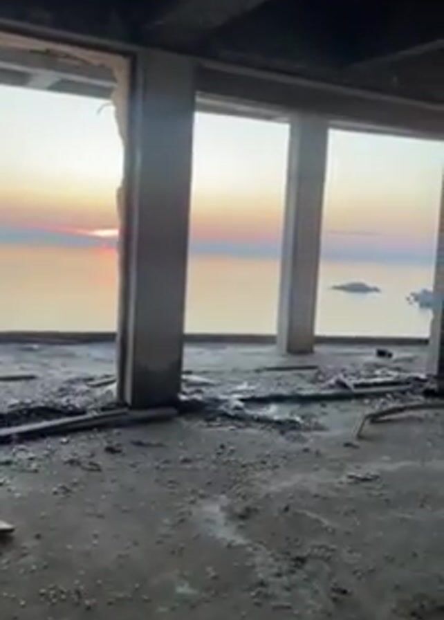 The camera pans around an unfinished or abandoned room, revealing a picturesque sunset over the ocean visible through large window openings
