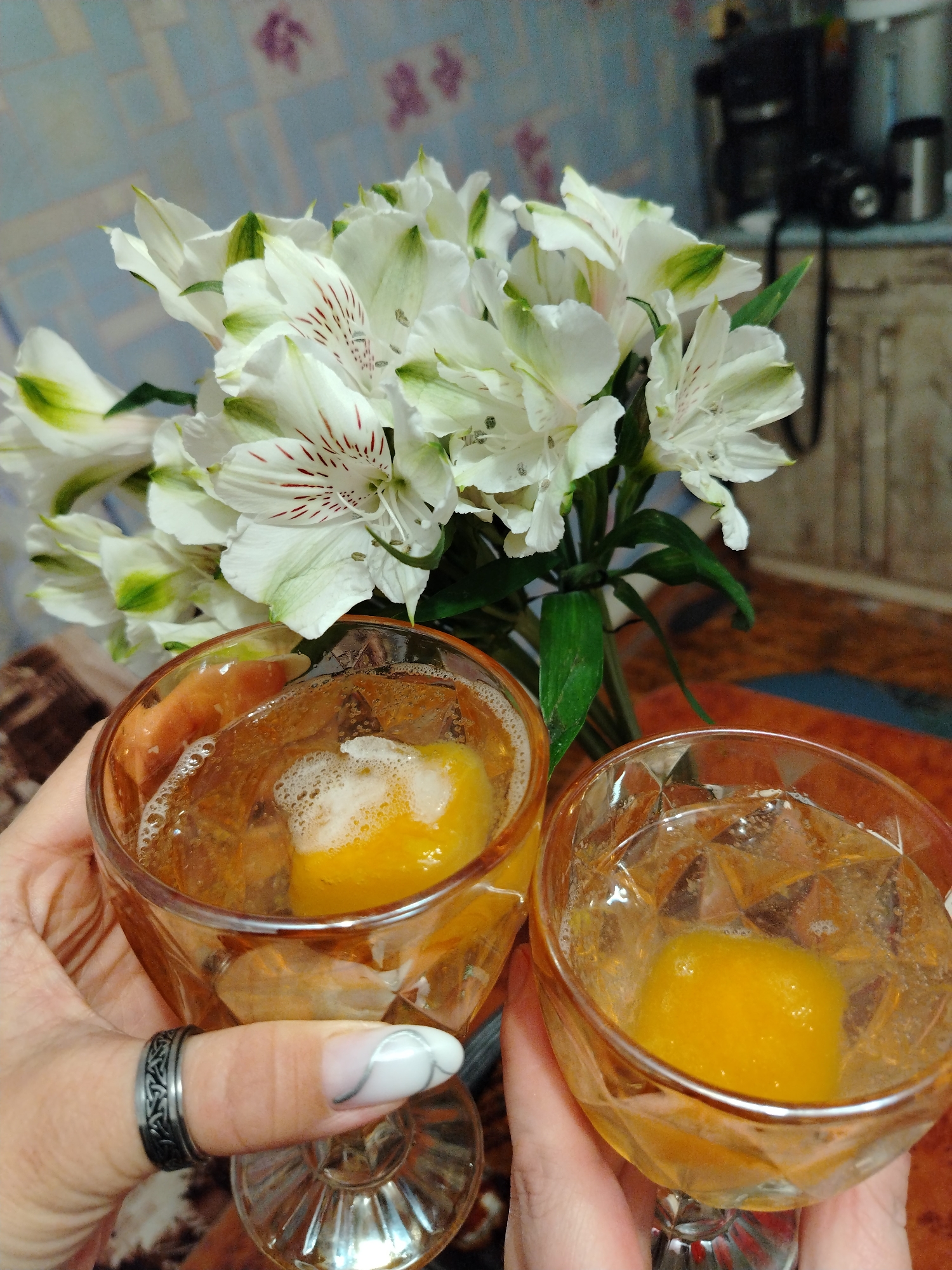 This image captures an indoor scene within the city of Kuyeda, Russia. Two hands hold amber-colored stemmed glasses in close proximity, suggesting a toast or clinking. Each glass contains a light brown liquid, ice cubes, and a prominent yellow, possibly fruit or sorbet-like, solid; the left glass displays frothy bubbles on the surface. The hand on the left wears a dark metal ring with an intricate Celtic knot pattern on the thumb and features a long, white fingernail with a silver curved design. In the foreground, a bouquet of white alstroemeria flowers is centrally positioned, characterized by red-brown striated markings on their inner petals and green-tipped outer petals, accompanied by dark green foliage. The flowers partially obscure a light blue wall or wallpaper with a faint, repeating pattern in the upper left background. Below the flowers and glasses, a table surface exhibits a reddish-brown and blue geometric pattern. In the blurry upper right background, dark kitchen appliances, possibly a coffee maker, are discernible on a countertop or shelf.