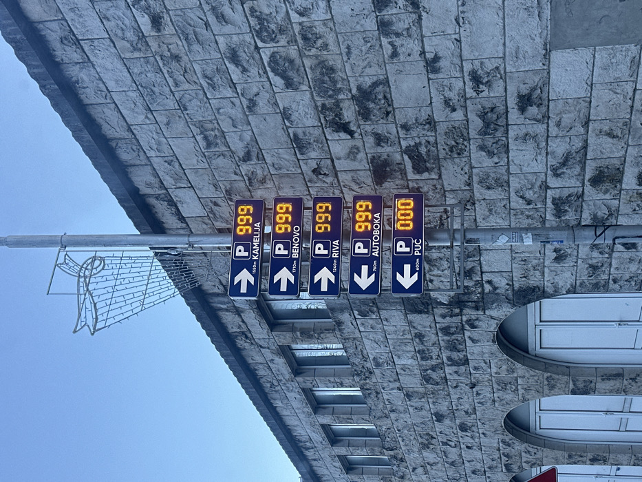 Parking signs displaying available spaces and distances to various locations. "Kamelija" (1550m) shows 999 spaces. "Benovo" (1710m) shows 999 spaces. "Riva" (1240m) shows 999 spaces. "Autoboka" (760m) shows 999 spaces. "Puč" (600m) shows 000 spaces. Arrows indicate the direction to each parking area. The signs are mounted under a stone archway with decorative lighting nearby.