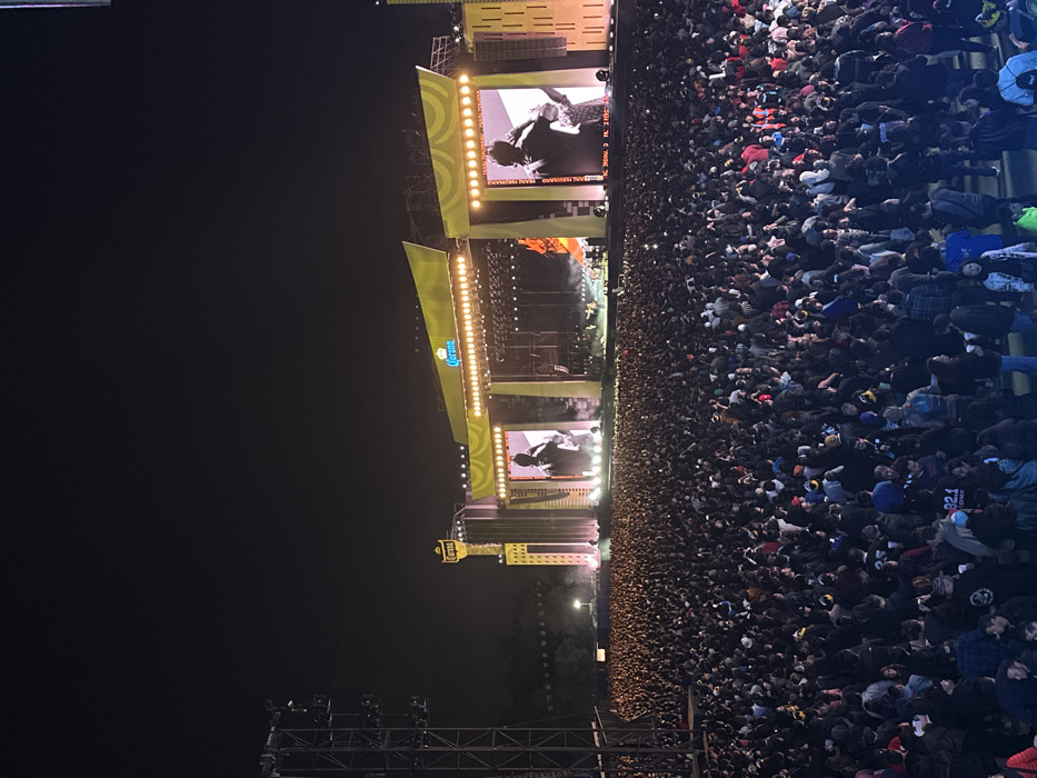 A vast crowd gathers at a concert at night. The stage is elaborate with large screens displaying the performance. Towering structures with lights and Corona branding flank the screens. A large decorative guitar is also present. The audience is densely packed, extending far into the distance. The sky is dark, highlighting the illuminated stage and crowd.