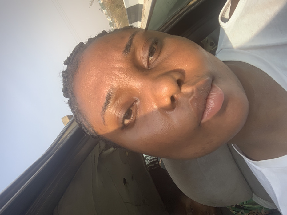 A dark-skinned female, estimated to be in her 20s or 30s, is seated in the foreground of a vehicle interior