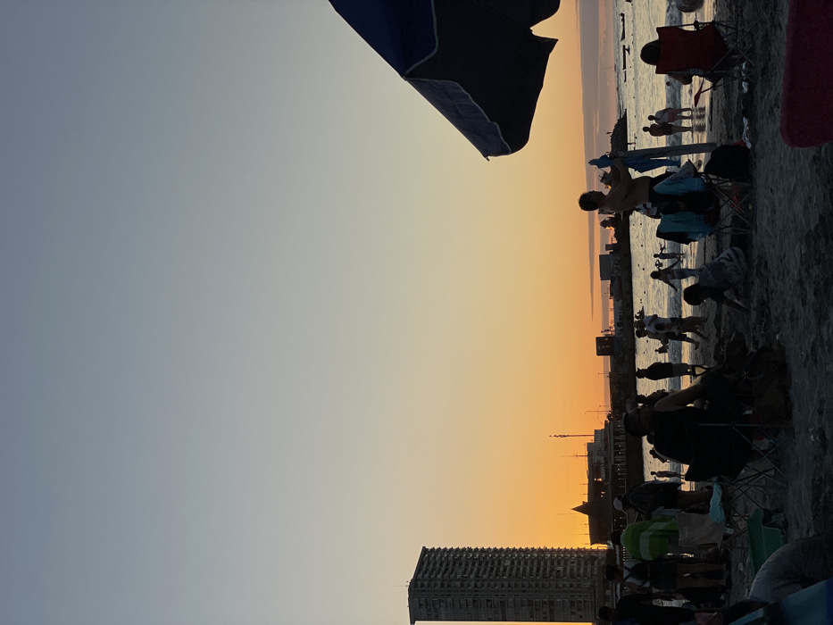 A beach scene at sunset features silhouettes of people engaging in various activities. Some individuals are sitting in chairs, while others are playing in the water. A building stands tall in the background, silhouetted against the orange and yellow sky. An umbrella's corner is visible in the upper left corner. The overall atmosphere evokes a sense of relaxation and enjoyment at the end of the day.