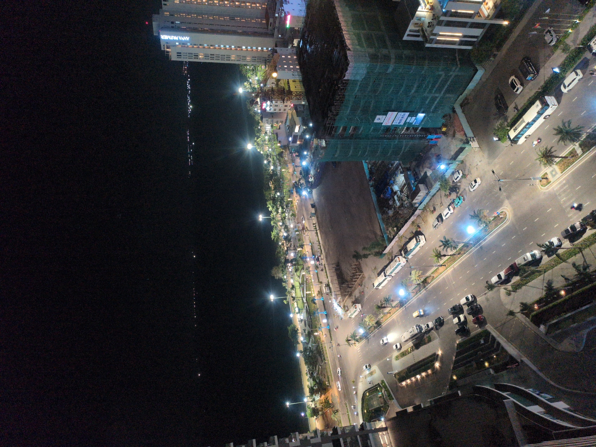 At night, the city of Quy Nhon Ward, Vietnam is photographed from above. The dark sea on the left contrasts with the lit coastline, where lights mark the road's edge and the adjacent buildings. Parallel to the coast, a road has moving vehicles, including buses and cars. Palm trees line the median. A skyscraper is under construction, veiled in scaffolding. The adjacent buildings are illuminated.