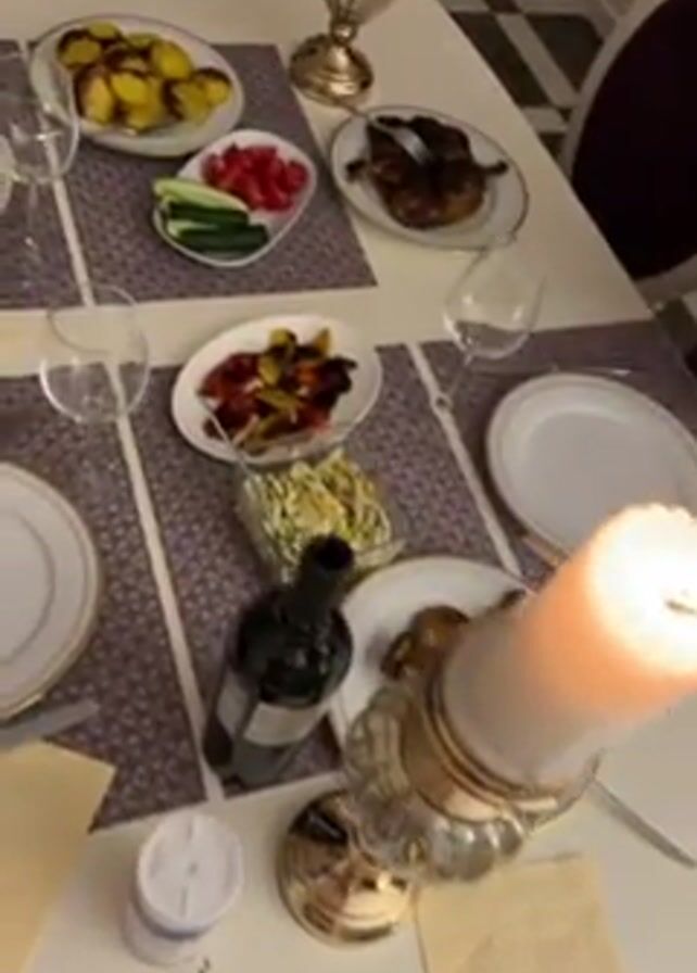 dining table set for a meal. The table is white, and there are four place settings, each with a plate, silverware, a napkin, and a wine glass. The placemats are patterned with a geometric design in shades of purple and grey. There are several dishes on the table, including a plate of roasted potatoes, a plate of sliced cucumbers and tomatoes, a plate of grilled vegetables, a bowl of salad, and a plate of roasted chicken. There is also a bottle of wine, a corkscrew, a container of salt, and a tall candle in a glass and gold candle holder. The background shows a glimpse of a checkered tile floor. The camera is positioned above the table, providing a top-down view of the scene.