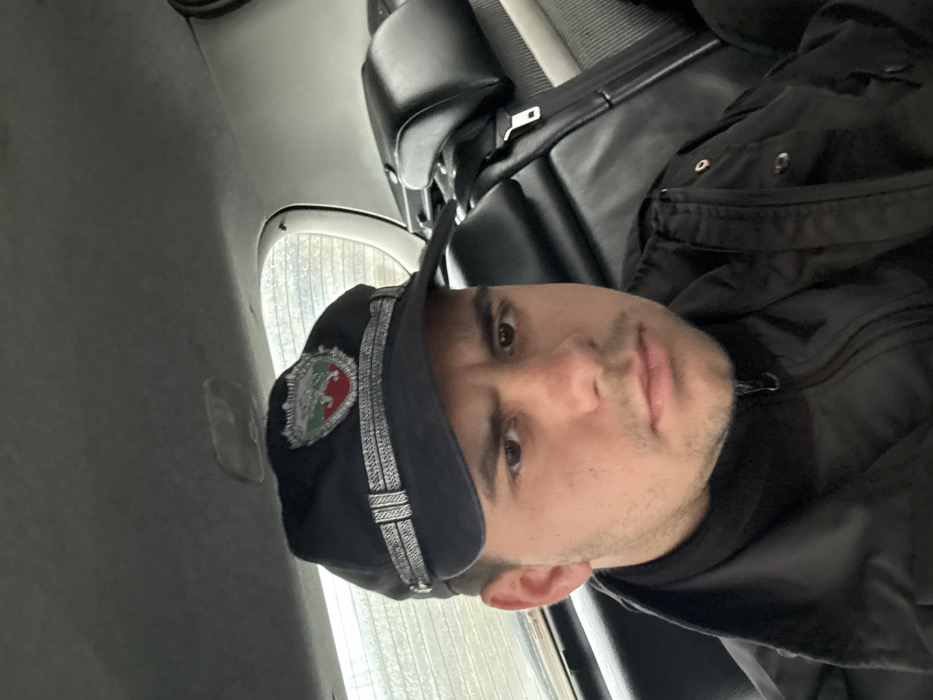 A male individual is seated in the rear passenger seat of a vehicle, facing the camera directly. He has short, dark hair and a neutral expression. He is wearing a dark, possibly black, uniform-style cap featuring a visor and two silver-colored bands across the front. An emblem, consistent with the national emblem or an official service emblem of Bulgaria, is affixed to the front of the cap, displaying a shield with a lion rampant and the colors red, white, and green. The individual is also wearing a dark, collared jacket with a visible zipper closure. The vehicle's interior features a light grey headliner and black leather or faux leather back seats, with a silver seatbelt buckle visible on the right. Through the rear window, a blurry outdoor scene is visible, indicative of daylight. While specific landmarks are not discernible, the emblem on the cap suggests a connection to Bulgarian official services. The scene is presumed to be within the city of Sofia, Bulgaria.