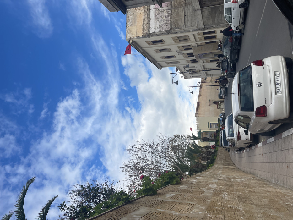 The image depicts a street scene in Mechouar Fes Jdid, Morocco, under a blue sky with scattered white cirrus and cumulus clouds