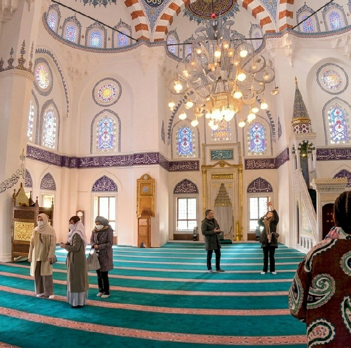This image depicts the interior of the Tokyo Camii mosque, located in Shibuya, Japan. The grand prayer hall features high white walls adorned with intricate purple and gold calligraphic friezes and numerous arched windows with vibrant stained-glass panels depicting floral and geometric motifs. A large, ornate multi-tiered chandelier with numerous illuminated bulbs hangs prominently from the high, domed ceiling, which is elaborately decorated with colorful geometric and calligraphic patterns in shades of blue, gold, and orange. The floor is covered with a turquoise-blue carpet marked with lighter horizontal stripes indicating prayer lines. On the right side of the hall, a white stone minbar with a spire-like top is visible, while a gilded mihrab (prayer niche) stands centrally at the far end. To the left of the mihrab, a tall, intricately carved wooden clock or display case is positioned. Further left, a decorative wooden screen or partition is present. Six individuals are observed within the hall. On the left, three women, all wearing face masks, stand in a line. The leftmost woman wears a light-colored headscarf and long coat. The middle woman, also wearing a dark headscarf and long coat, holds a smartphone. The third woman, in a grey headscarf and patterned coat, carries a white handbag. In the mid-ground, a man in a dark jacket stands to the left, gesturing with his right hand as he faces a woman on his right. This woman, wearing a dark coat and scarf, holds a smartphone or camera aloft, pointing it towards the mosque's interior, likely capturing a photograph. In the immediate foreground, the back of a person wearing a brown garment with a large paisley pattern is visible, suggesting they are the photographer.