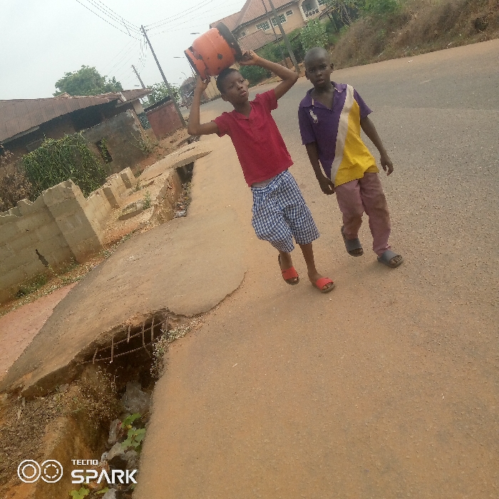 Two boys stand on a road. The first boy, wearing a red shirt and blue checkered shorts, balances an orange object on his head. The second boy, in a purple and yellow shirt with red pants, stands next to him. The road is paved with a drainage ditch running alongside it, and buildings are visible in the background. The image is slightly blurry and appears to be taken with a mobile phone, evident from the watermark.