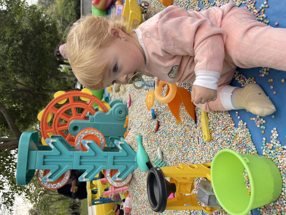 - "A blonde-haired toddler with blue eyes, wearing a peach-colored long-sleeved top and matching pants, and light-colored socks, sits on a blue mat covered in numerous small, multi-colored pastel pellets" by FM-oJoph1, licensed under CC BY 4.0