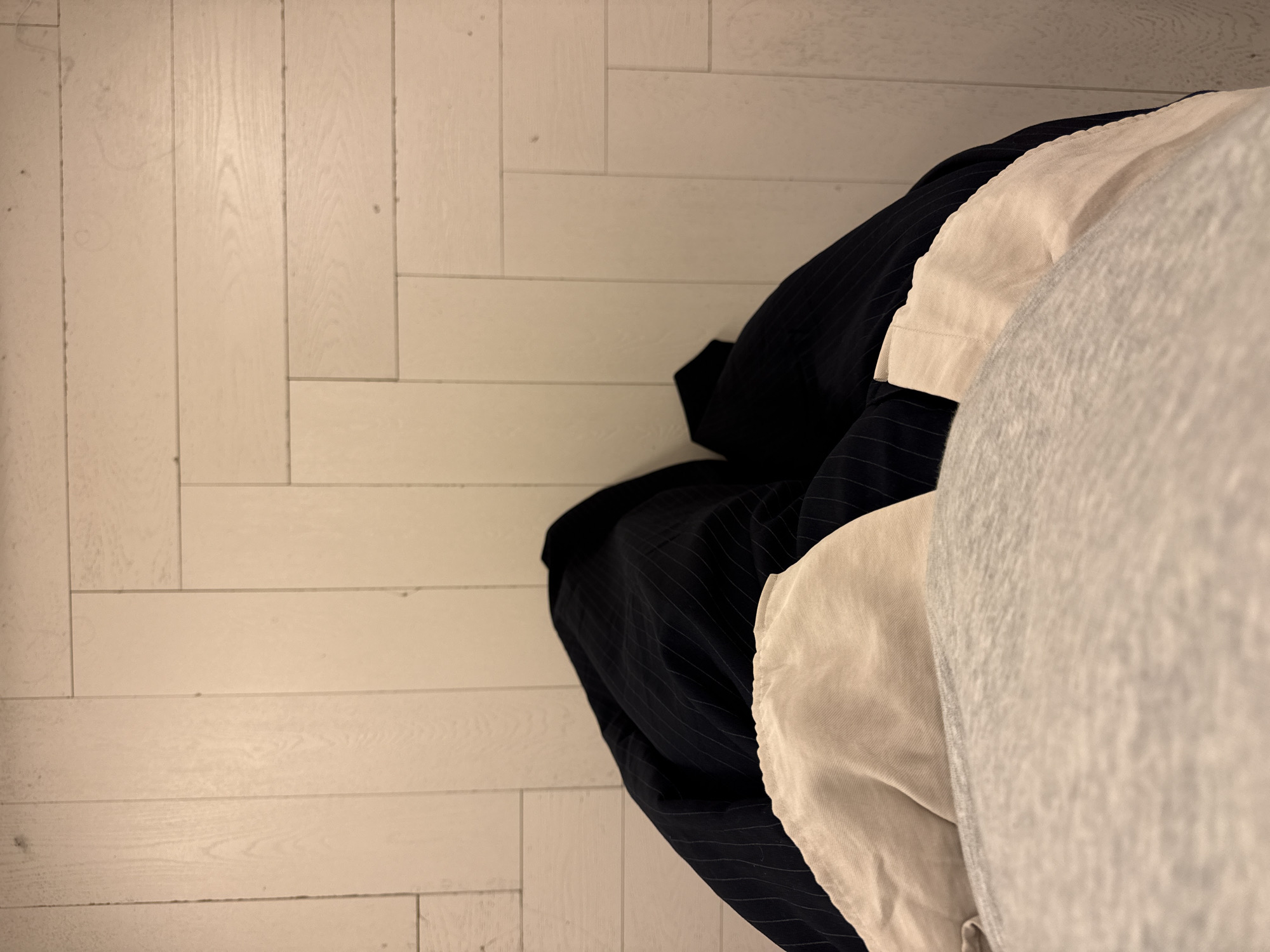 The image displays a high-angle view of a person's lower torso and legs, standing on a light-colored wooden floor in Gondomar, Portugal. The floor consists of light beige or off-white wooden planks arranged in a staggered pattern, showing minor surface wear. The person is wearing multiple layers of clothing: a light grey, textured garment (possibly a sweatshirt) in the foreground, covering the abdomen; beneath it, a light beige or cream-colored fabric, likely a shirt or trousers, with visible folds; and a darker, possibly navy blue, pinstriped fabric (likely trousers) visible on the outer sides of the legs. No faces, hands, or distinct features of the individual are visible.