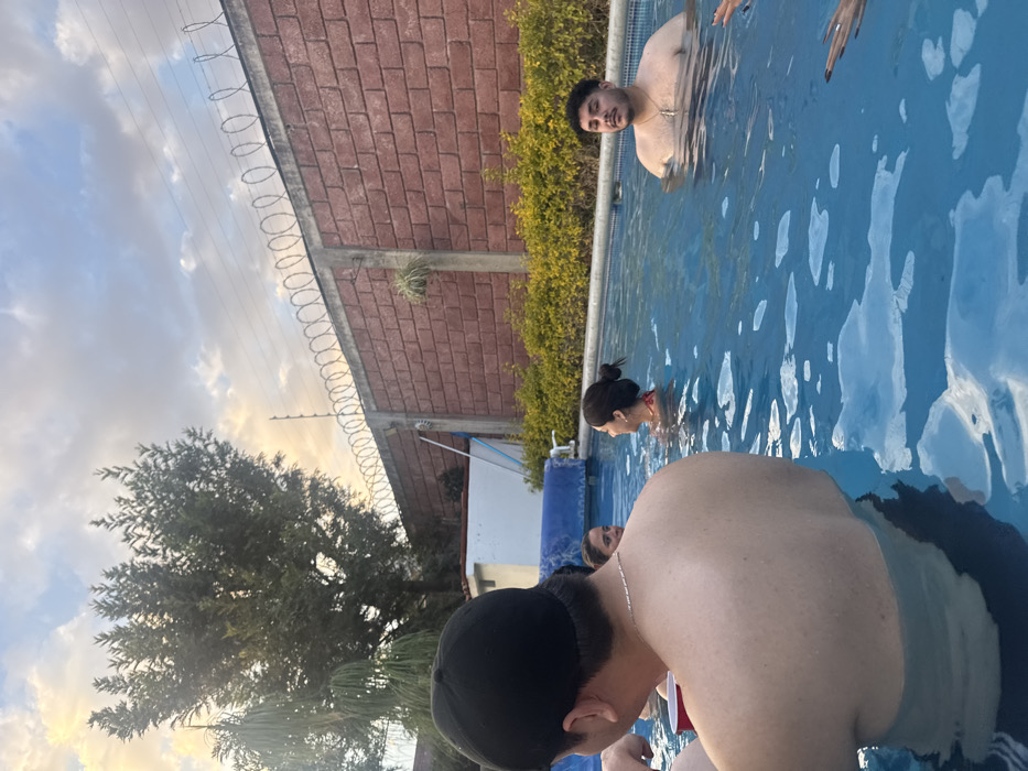 The scene depicts an outdoor swimming pool gathering in Tenextepec, Mexico, under a partially cloudy sky with light suggesting late afternoon or early evening