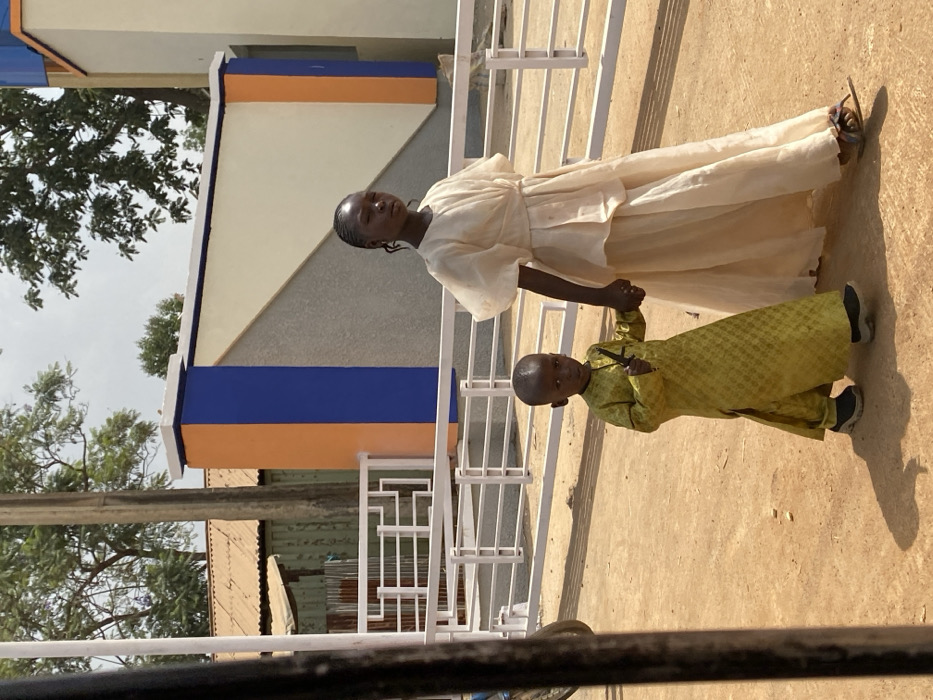 An outdoor scene in Kuru Dungus, Nigeria, depicts two individuals walking on a light brown, unpaved surface under daylight. A young girl, approximately pre-teen, with braided hair and dark skin, is positioned on the right. She wears a light-colored, long dress with puffed sleeves and sandals, looking directly at the viewer. Her left hand holds the left hand of a younger boy, positioned to her left. The boy, appearing to be a toddler, has a shaved head and dark skin. He wears a patterned yellow-green long tunic over pants and dark athletic shoes. His right hand holds a small, dark object resembling a toy knife or tool. He also looks directly at the viewer. Shadows from the subjects are cast on the ground to their left. In the background, a white railing or fence runs horizontally. Behind the railing, a building or wall features sections painted light cream, orange, and blue. To the far left background, a structure with a corrugated metal roof and a faded green or grey wall is visible. Above the structures, trees with green foliage are present against a light sky. A dark vertical post is partially visible on the far left of the frame.