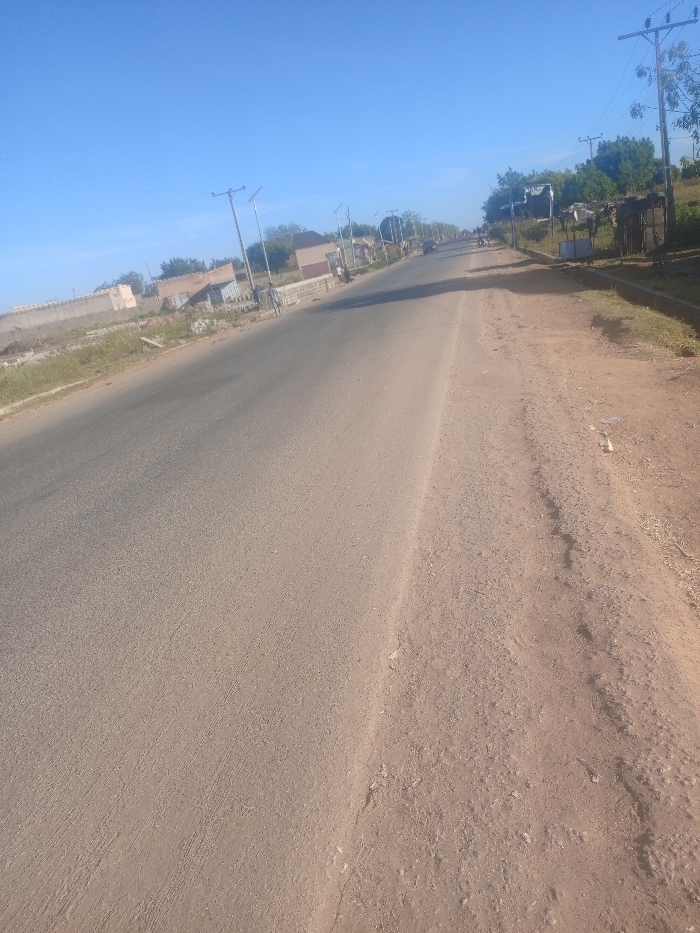 A sunlit road stretches into the distance under a clear blue sky. The asphalt paving occupies the left side, while the right side is a dirt shoulder. Utility poles line the road, hinting at a nearby community. Buildings and structures are visible on the left side, some behind a long wall. Faint figures are discernible in the distance, suggesting pedestrian activity. The overall scene evokes a sense of a rural or suburban area on a sunny day.
