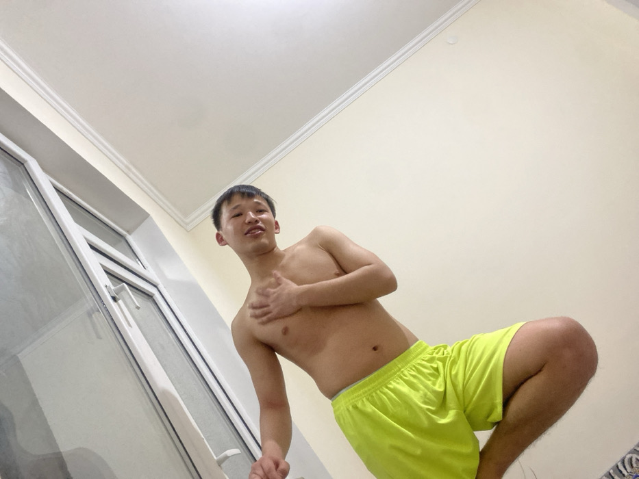 A shirtless young man in bright yellow shorts stands at an angle, looking down at the camera