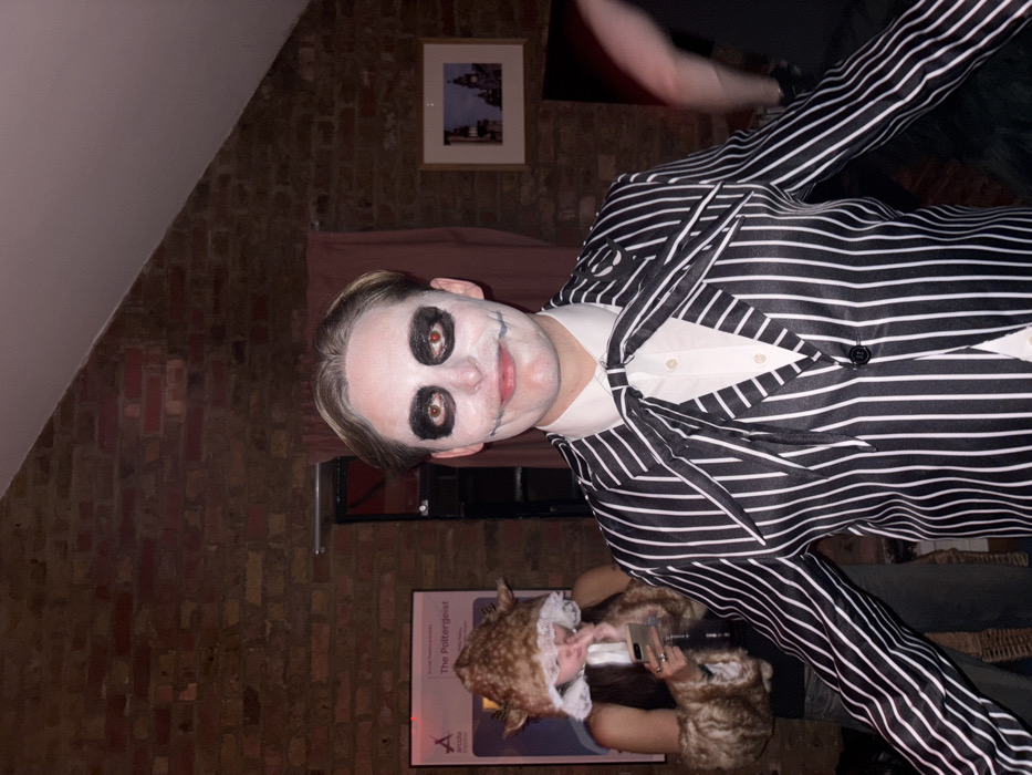 The scene depicts an indoor social gathering, identified as the Arcola Theatre at 24 Ashwin Street, Dalston, London E8 3DL, United Kingdom, based on a visible poster in the background. The environment features an exposed brick wall, a dark, slanted ceiling, and reddish-brown curtains, all illuminated by dim, artificial lighting. In the foreground, a Caucasian individual stands centrally, facing the camera. This person is costumed with white face makeup, black circles around the eyes, and black lines drawn from the mouth corners, resembling a skeletal or Joker-like character. They possess light brown hair, parted on the side. Their attire consists of a white collared shirt, a black-and-white vertically striped jacket, and a black ribbon bow tie. Their right eye exhibits a red-eye artifact. To the left and slightly behind, a second individual is partially visible, wearing a brown, fur-trimmed hooded costume resembling an animal. This person holds a dark-colored drink cup with a straw in their left hand and a smartphone in their right, appearing to interact with the device. On the right side of the frame, a framed photograph of a cityscape is affixed to the brick wall, and a blurred limb from a third individual is partially visible.