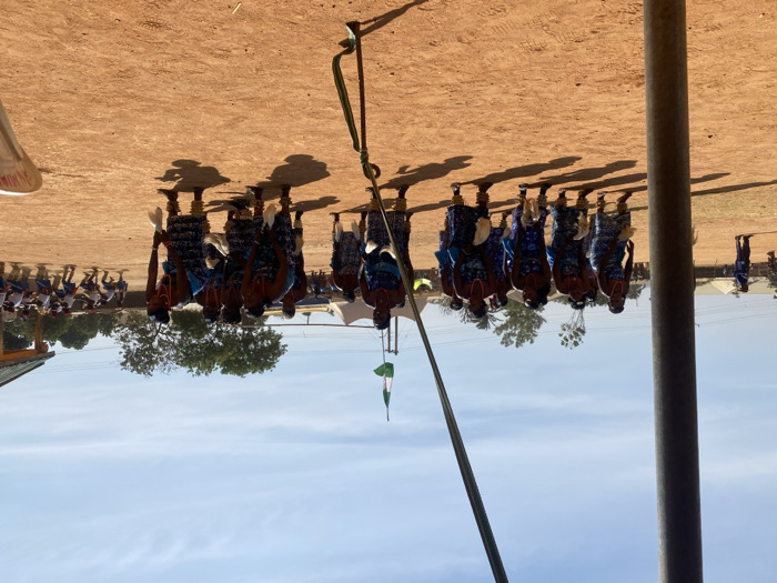 The image depicts an outdoor cultural performance taking place on a reddish-brown dirt field in Miango, Nigeria, under a clear blue sky. In the midground, a group of approximately ten to twelve women are engaged in a synchronized dance. They are uniformly dressed in blue patterned fabric wraps or dresses, some with light blue tops, and wear multi-strand necklaces, predominantly red and blue. Each woman holds a white, feathered, or fluffy implement in each hand and is positioned in a bent-forward, crouched stance, casting distinct shadows to their right. In the far background to the right, another group of individuals, possibly men or boys, are also seen performing in formation, wearing white tops and dark bottoms. Scattered across the background are several white tent structures, indicative of an event setup. A green-and-white flag, likely the Nigerian flag, is visible on a flagpole near the center-right background. A building with a green roof is partially visible on the far right. Sparse trees and shrubs are present in the distant background. A large, dark metallic pole dominates the left foreground, with a tension strap or rope extending diagonally towards the lower right. The ground is dry earth, suggesting a warm climate.