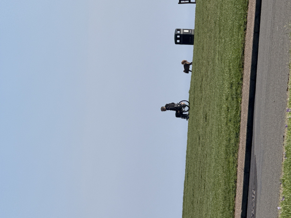 The image displays an outdoor scene on a sunny day, likely in a park or clifftop area of Gorleston-on-Sea, United Kingdom. The upper two-thirds of the frame are dominated by a clear, light blue sky. The lower portion features a bright green, well-maintained grassy slope. At the bottom edge, a section of grey paved road with a darker kerbline is visible, with small purple flowers in the grass alongside it on the left. On the grassy slope, in the mid-ground, a male individual is seated stationary in a manual wheelchair. He wears a dark-colored, possibly black, hooded jacket and is positioned facing towards the right side of the frame. To the right of the individual in the wheelchair, a small, fluffy dog with brown fur stands on the grass, also facing right. Further to the right on the slope, a black public litter bin with two square openings is present. A partial view of a dark-colored park bench is visible on the far right edge of the frame, behind the litter bin. The scene is illuminated by direct sunlight.
