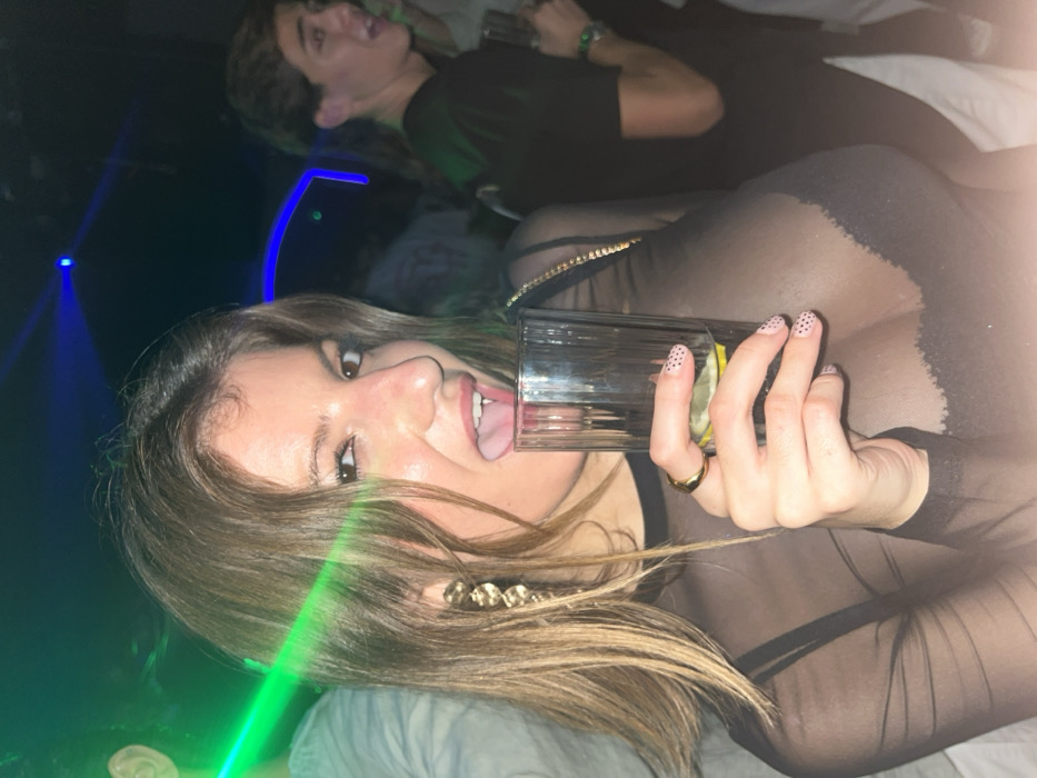The image depicts a young woman centered in an indoor nightlife environment, consistent with a nightclub or bar