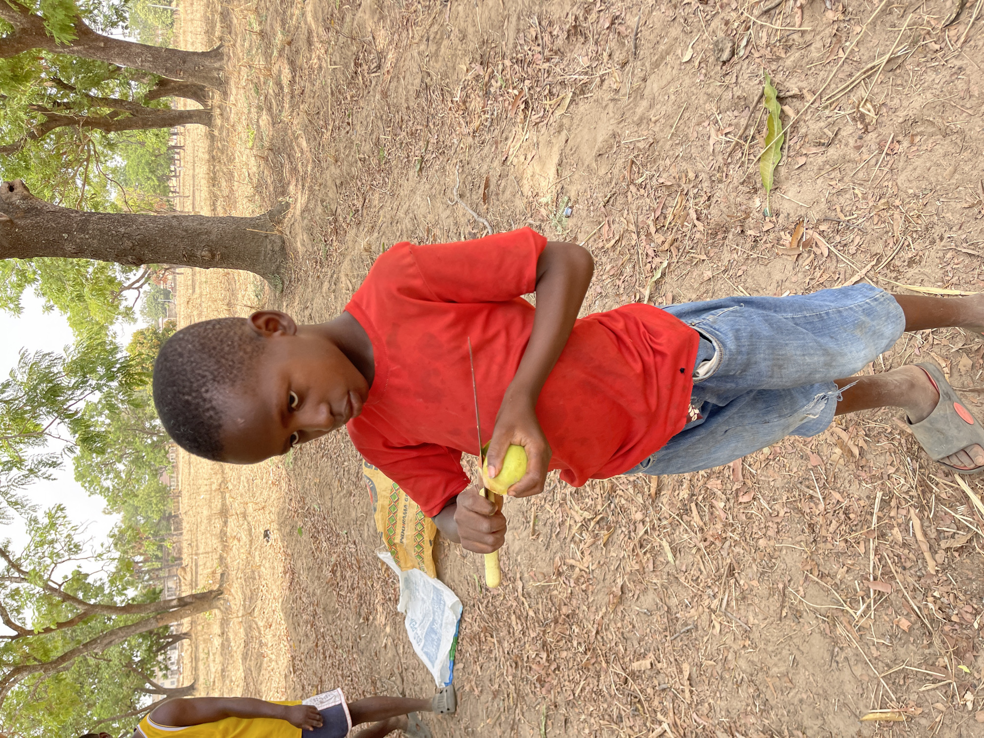 In Akwanga, Nigeria, a young Black male, approximately 5-8 years old, is depicted in a standing position, engaged in peeling a light green fruit with a knife. He wears a red short-sleeved t-shirt, blue denim shorts with torn hems, and grey slide sandals. His attention is focused on the fruit in his left hand and the knife in his right. Partially visible to the far left is a second individual, likely an adult male, wearing a yellow sleeveless top and dark shorts. The ground is dry, reddish-brown soil covered with sparse dry leaves and twigs. Two discarded sacks, one white with blue and green markings and one yellow with "INDORAMA G" visible, lie on the ground behind the primary subject. The background features multiple trees with dark trunks and green foliage, with faint outlines of distant structures visible between them under bright daylight conditions.