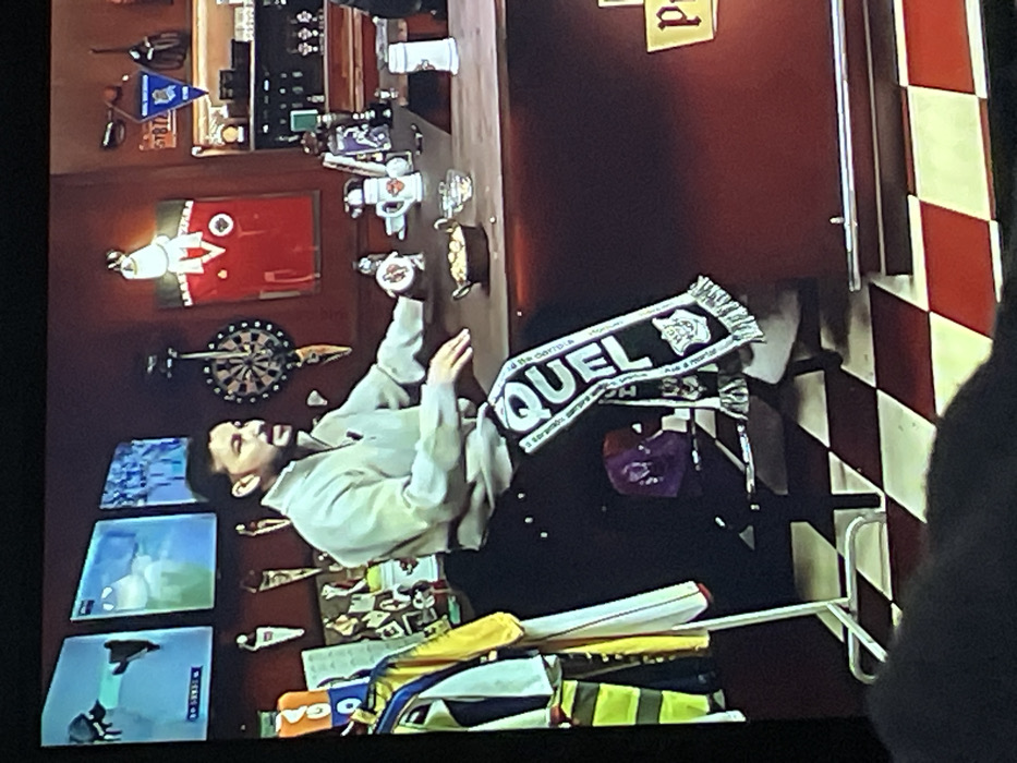 A man sits in a brightly lit room with red walls. A bar with beer taps and various decorative items sits behind him. There is a dartboard, posters, and small pennants attached to the wall. The man is wearing a light-colored jacket and a dark shirt. A black and white scarf with the text "AQUEL" is draped over his lap. A red and white checkered wall is partially visible on the right. There are some clothing articles placed below him.