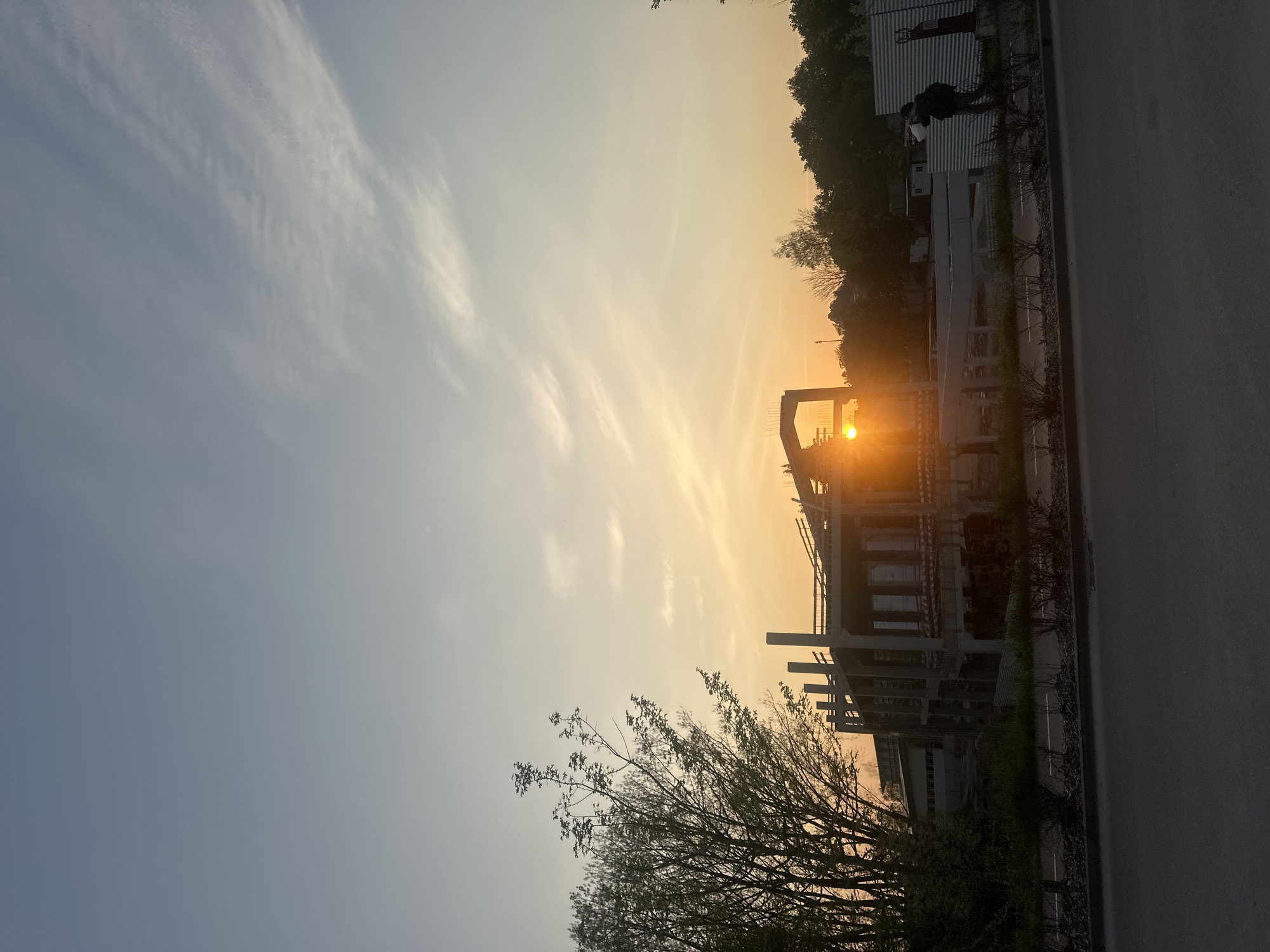 The image depicts an urban landscape in Guimarães, Portugal, during golden hour, characterized by a low sun creating a strong orange-yellow hue near the horizon, transitioning to light blue in the upper sky with wispy white clouds. The foreground presents a dark asphalt road spanning the width of the frame, bordered by a concrete curb and a narrow median containing sparse, low shrubs and light-colored gravel. Dominating the midground is a multi-story concrete building under construction, its structural frame of columns, beams, and slabs partially silhouetted against the sun. The sun's disc is visible within the building's outline, generating a prominent lens flare. Rebar extends upwards from the top level of the structure. To the left, a cluster of deciduous trees with light green foliage is present. To the right, a corrugated metal fence, partially adorned with a red motif resembling an industrial pump or hydrant, encloses part of the construction zone. A single individual is visible behind this fence, on the right side of the frame, facing right. This person is dressed in dark clothing, wears a backpack, and holds a white object, possibly a bag or container, in their raised left hand. Faint outlines of temporary structures or trailers are discernible behind the fence, backed by dense, dark green trees forming the distant horizon.