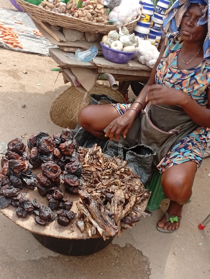 A woman sits behind a round wooden table piled with two types of dried fish. One type appears dark and charred, while the other is lighter and resembles dried fish fillets. She wears a colorful dress, an apron, and a head covering. Behind her, a cart holds baskets of produce including carrots, ginger, and white vegetables. She is likely selling her wares at a local market.