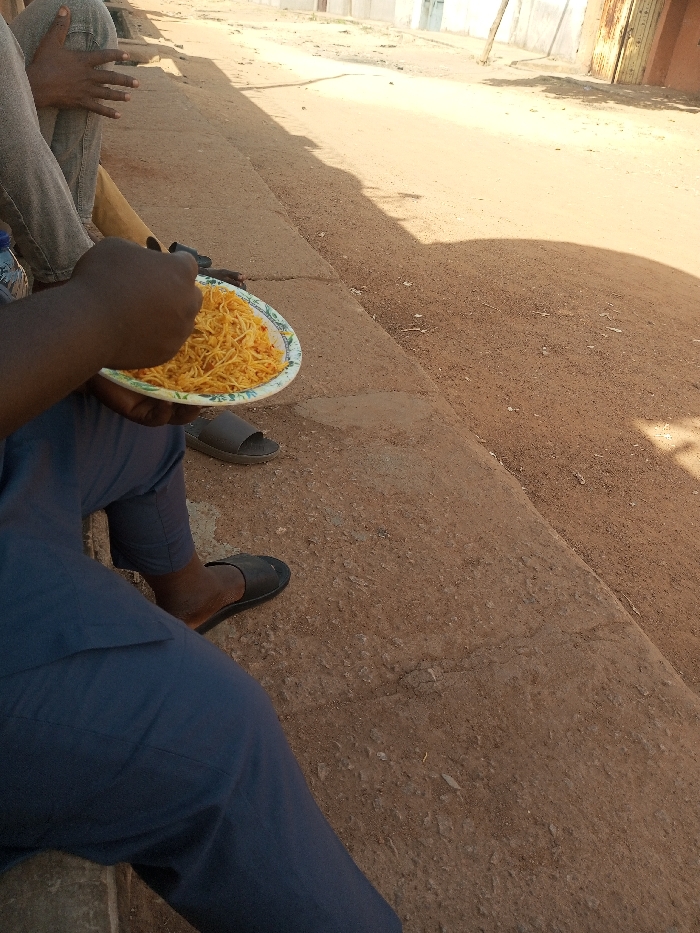 The image captures a street scene in Rigasa, Nigeria. In the foreground, two individuals are seated on a raised concrete or earth curb beside an unpaved, reddish-brown dirt road. The primary subject, wearing dark blue trousers and black slip-on sandals, holds a white, patterned plate containing orange-colored noodles, actively eating with a utensil partially obscured by their hand. To the upper left, a second individual is partially visible, wearing light grey trousers and tan sandals, with hands resting. A blue plastic bottle is partially visible near the second individual's leg. Strong sunlight casts distinct shadows across the dirt road. In the background, across the unpaved road, buildings with light-colored walls and at least one corrugated metal door are visible, along with a white vertical pole.
