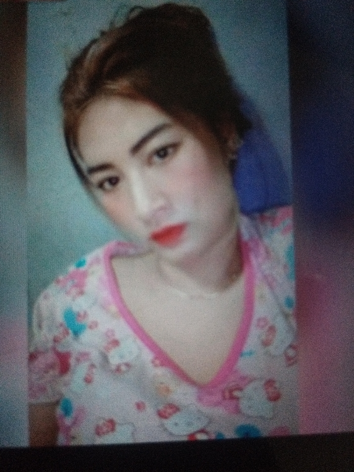 A forensic portrait image, captured in or depicting a scene from the city of Bogor, Indonesia, features a young adult female from the chest up. The individual has dark brown hair, light skin, and wears red lipstick and pink blush. She is dressed in a light-colored V-neck top with a pink trim, adorned with a repeating pattern that includes small white, pink, and light blue 'Hello Kitty' faces and other abstract shapes. A thin, light-colored necklace is visible around her neck. Her head is slightly tilted, and she appears to be looking directly at the viewer. The background is an indistinct indoor setting, with a light bluish-green wall visible on the left and a darker blue/purple vertical element on the right. The image quality is moderate, exhibiting digital noise, and appears to be a photograph of a screen, indicated by a dark horizontal band at the bottom. No other people, specific actions, or interactions are discernible.