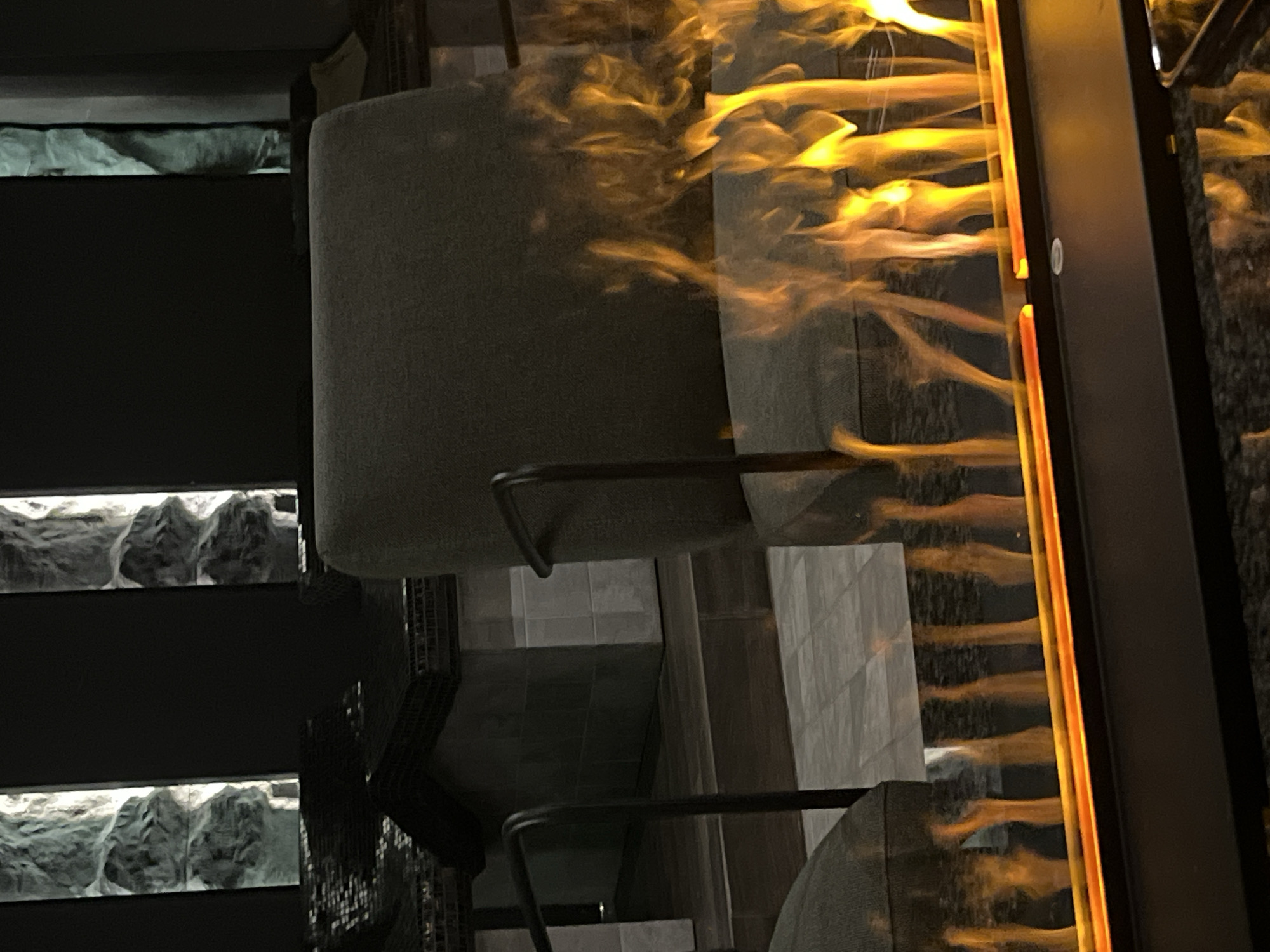 The image depicts an interior scene with two chairs of similar design placed next to each other, one behind the other. The chairs have a gray-green hue with metal armrests. A structure with multiple illuminated levels, possibly displaying a decorative rock feature, is to the left of the chairs. A vertical element resembling a fireplace or display case is on the right, with bright orange light emanating from within, giving the appearance of flames or a fiery glow. The image's orientation is unusual, suggesting it may be rotated from its original perspective. The location, Sofia, Bulgaria, is provided as background information but is not directly discernable from the visual details of the image.