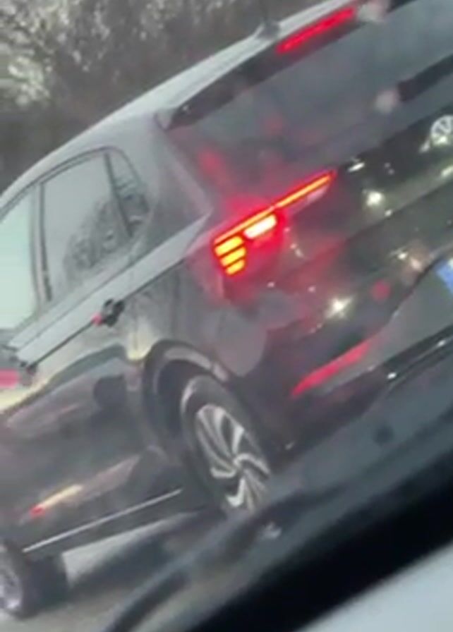 view from inside a car looking out onto a road with several cars in stop-and-go traffic. The first car in view is a dark gray Volkswagen Polo, followed by a dark gray Audi A3. Further up the road is a white car. All cars have their brake lights illuminated. The road appears wet, and there are trees visible in the background. The camera is likely behind the windshield of the car from which the video is being taken.