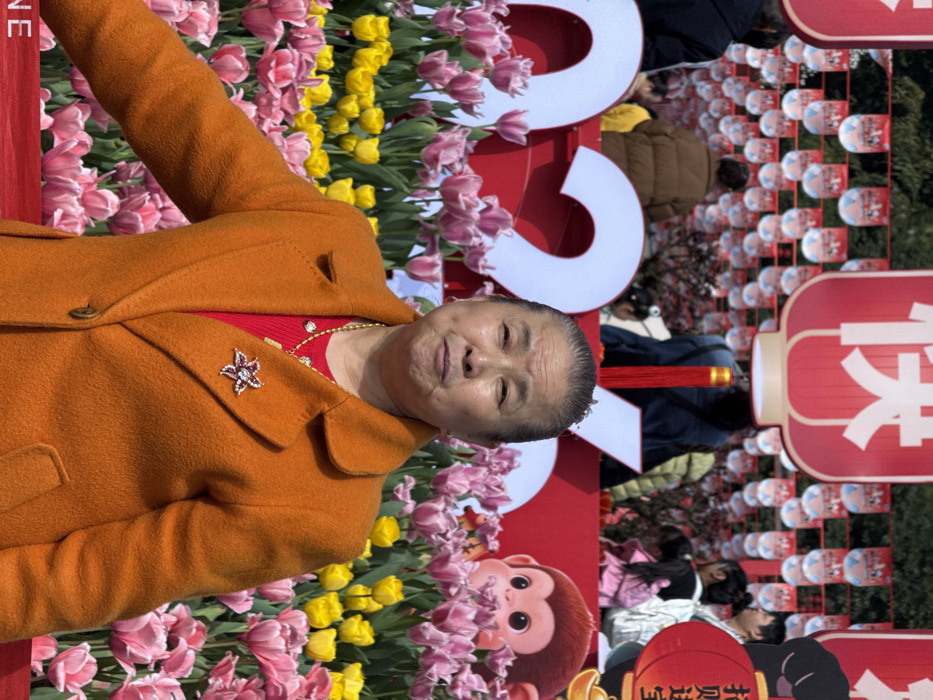 The image depicts an elderly East Asian woman positioned centrally in the foreground, facing the camera. She wears an orange collared coat over a red top, adorned with a gold-colored necklace and a star-shaped brooch with clear and red stones on her left lapel. Her hair is pulled back, and she has a subtle smile. Behind the woman, a dense display of blooming tulips in shades of pink and yellow forms a vibrant midground. The background reveals a large outdoor festive setup in Jiulongpo District, China. This includes prominent red signage featuring large white Chinese characters, with "快" clearly visible, and partially visible numbers "02" incorporating a heart shape, possibly indicating a year. To the right of the numbers, a cartoon monkey character with large eyes is visible, partially obscured by the tulips. Numerous smaller, identical red banners with white designs are strung overhead in rows, creating a canopy effect. Additional red banners with gold graphics and Chinese text, including "招财进宝", are visible on the far right. Multiple blurred figures, comprising adults and children, are present in the deeper background, indicating a public gathering.