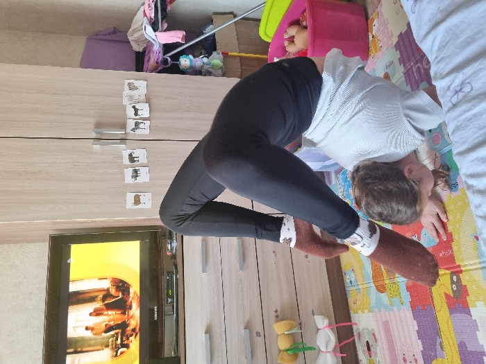 An indoor scene depicts a child performing a backbend on a multi-colored foam playmat. The child, with light brown hair, wears a white short-sleeved shirt, black leggings, and brown socks with patterned white cuffs, with their head resting on the mat and hands flat near their head. In the background, to the left, a dark flat-screen television displaying an interior scene with two individuals is positioned atop a light wooden dresser. To the right of the dresser, a light wooden two-door wardrobe features six white cards with animal illustrations affixed across its front. Further right, a pink bucket with a green rim contains a doll, and a clothing rack draped with garments is partially visible. Two decorative fabric bows are attached to the wall near the dresser. The floor is covered by the playmat in the central foreground, and a white sheet or duvet is visible on the bottom right. The exact location in the city of Krasnodar, Russia, cannot be determined from the visual information provided.