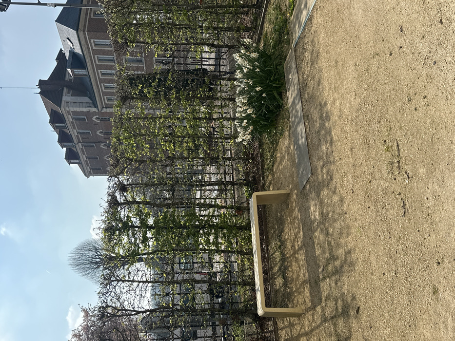 The scene depicts an outdoor public space within the city of Beauvais, France, under bright daylight. The foreground consists of a light brown gravel surface, interspersed with small stones. A light-colored, U-shaped bench, appearing to be constructed from smooth concrete or stone, is situated on the left side of the gravel, casting an identifiable shadow. To the right of the bench, a rectangular, flat concrete slab is partially embedded in the gravel. Adjacent to this slab, a dense clump of white flowering plants, characterized by green stems and multiple blossoms, is present within a small garden bed. The midground is dominated by a formal hedgerow of trees, meticulously pruned and trained into a grid-like espalier pattern, exhibiting emerging light green foliage. Beyond this foliage, a large, multi-story building of reddish-brown brick construction with light-colored stone accents and a dark, multi-pitched tiled roof is visible in the background. The building features multiple windows and dormers, with a tall, slender flagpole extending from its highest point. The sky overhead is clear blue with minimal scattered clouds. No individuals are present within the frame.