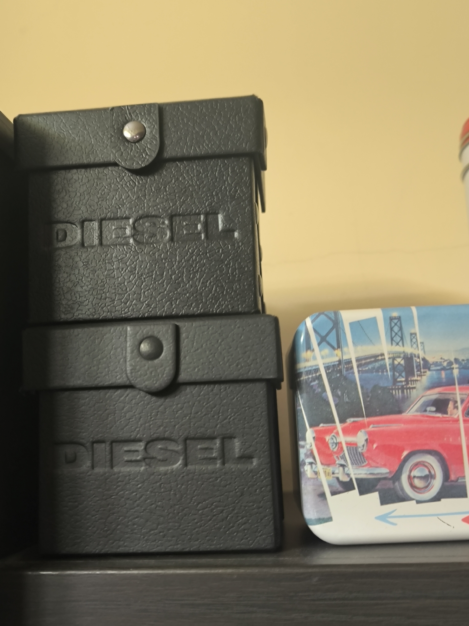 two black Diesel boxes stacked on top of each other on a shelf, next to a rectangular tin with a red car and a bridge depicted on it. The location is not discernible from the image. There is no information about people, actions, or interactions. The environment is a shelf with a wall behind it.