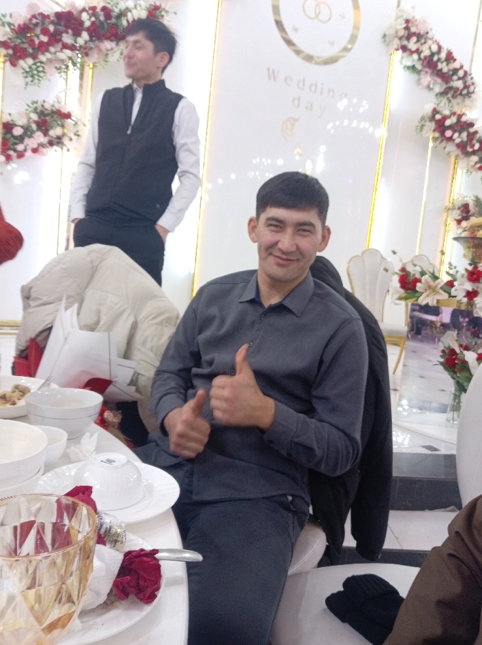 The image depicts an indoor celebratory event, likely a wedding reception, at a venue in Unknown, Unknown. In the foreground, a male individual with short, dark hair and an Asian appearance is seated at a table, directly facing the camera. He is smiling and giving a double thumbs-up gesture with both hands. He wears a dark grey long-sleeved collared shirt and dark trousers. A dark jacket is draped over the back of his white upholstered chair. The table in front of him is covered with a white tablecloth and holds several white ceramic bowls, some with residual food, one inverted white bowl, white plates, a clear patterned glass with a gold rim, and crumpled red floral decorations or napkins. In the mid-ground, a beige coat is draped over a chair, partially obscuring the table behind it. In the background, another male individual with short, dark hair and an Asian appearance is standing, facing left with his hands in his pockets. He wears a white long-sleeved shirt and a dark vest. The background consists of a white wall adorned with vertical golden decorative frames and extensive floral arrangements of red and white flowers, including roses and lilies. One golden frame prominently displays the text "Wedding day" and two interlocking ring symbols. The floor is light-colored, possibly tiled, with dark accents. A black knitted item rests on a chair in the lower right corner of the frame.