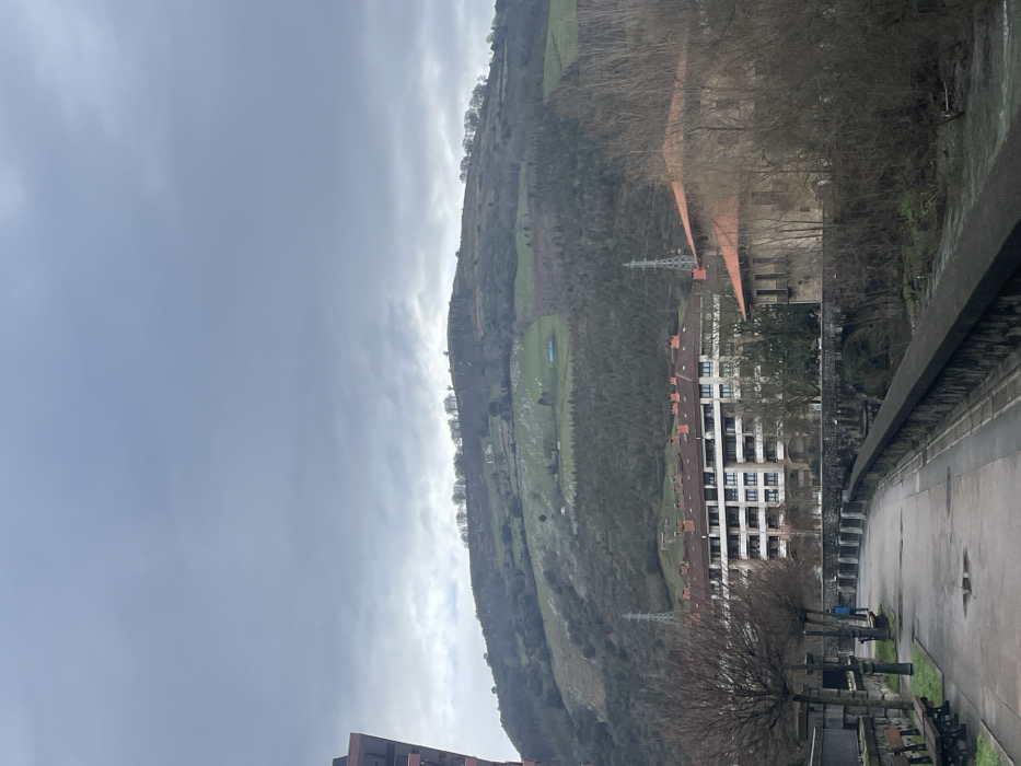 The image depicts a view within Azpeitia, Spain, under an overcast sky. In the foreground, a paved pedestrian promenade extends diagonally from the lower left, bordered by a low stone wall on the right and a stone retaining wall on the left. Two dark wooden benches and three black streetlights are visible along the left edge of the promenade. A single individual, wearing a blue jacket, is observed walking away from the camera on the promenade. To the right of the promenade, a dark stone wall separates it from a flowing river characterized by visible currents. A multi-arch stone bridge spans the river beyond this wall. In the midground, across the river, a multi-story residential building with a light-colored facade, numerous rectangular windows, and a brown tiled roof is prominent. To its right, a smaller, older-style building with a lighter-colored exterior and a red tiled roof is partially obscured by bare deciduous trees. Two grey lattice-type power transmission towers are situated on the lower mountain slopes; one is visible behind the residential building, and another is further to the right. The background is dominated by a large mountain, exhibiting various shades of green vegetation, including dense dark green forestation on its lower slopes and lighter green grassy areas at higher elevations. Multiple white or light-colored structures, identified as buildings, are interspersed across the mountain. A distinct blue tarp or covering is visible on an upper grassy slope. A line of bare trees defines the mountain's crest against the uniform grey, cloudy sky.