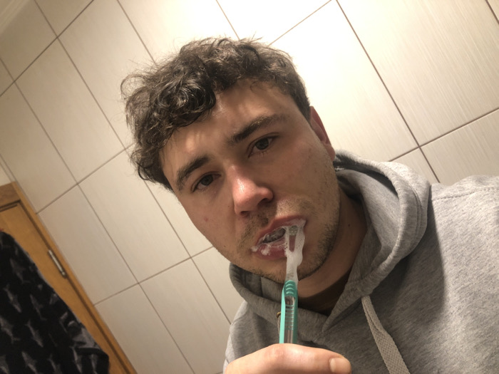 - "A man with curly brown hair and a gray hooded sweatshirt is brushing his teeth" by FM-ljeCD2, licensed under CC BY 4.0