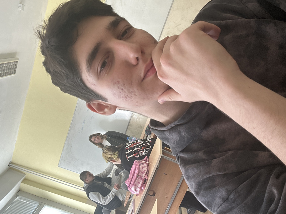 The image depicts an indoor scene within a classroom in Pravets, Bulgaria. In the foreground, a young male with short dark hair and visible acne scars on his left cheek is taking a selfie. He is wearing a dark grey patterned hoodie and has his right hand positioned near his chin. His gaze is directed at the camera. The background reveals a classroom environment with light yellow walls and a white ceiling. On the left, a window with horizontal blinds is visible. Several wooden student desks are arranged in rows. Three other individuals are present: 1. A male with short dark hair, wearing a grey vest over a light grey long-sleeved shirt and grey sweatpants, is seated on or leaning against a desk on the left side of the frame. 2. A student with light-colored hair, wearing a dark long-sleeved shirt with white text, is seated at a desk with their back partially to the camera. A pink backpack rests on the desk in front of them. 3. A female with long brown hair, dressed in a black leather jacket over a white top, stands near a whiteboard on the right side of the frame. She is smiling and looking towards the camera's general direction. A clear plastic water bottle is on the desk in front of her. A white marker board with faint Cyrillic writing is mounted on the rear wall. A fluorescent light fixture is visible on the ceiling.