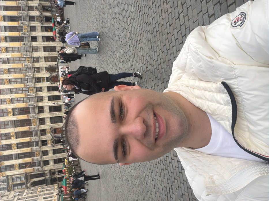 A male individual with fair skin, a closely shaved head, dark eyebrows, and green eyes smiles directly at the camera, capturing a selfie. He wears a white quilted puffer jacket, identifiable by a Moncler logo on the left arm, over a white t-shirt. He stands on a large outdoor square paved with grey cobblestones. In the background, the distinctive ornate guild houses of the Grand Place (Grote Markt) in Brussels, Belgium, are prominently featured. These multi-story buildings exhibit intricate facades, numerous windows, and extensive golden detailing. Numerous other individuals are visible throughout the square, engaged in walking and standing. On the left side of the scene, some red and green striped awnings are present, indicative of outdoor commercial establishments such as cafes or market stalls.