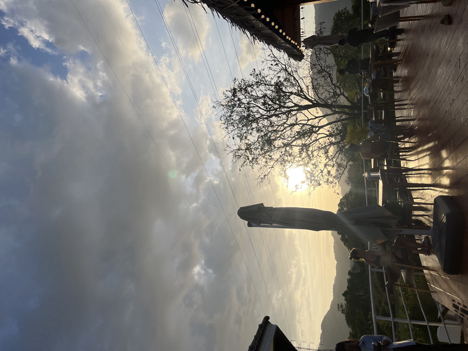 An elevated outdoor patio in Kathu, Thailand, is depicted during a sunset or sunrise