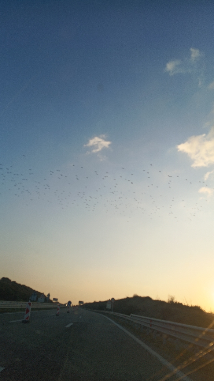 The image depicts a multi-lane asphalt highway under a sky transitioning from deep blue overhead to a pale orange-yellow at the horizon, indicative of either sunrise or sunset. A large, dispersed flock of numerous small, dark avian subjects is observed in flight across the middle section of the sky. The highway, viewed from a forward perspective, shows white dashed lane markings and curves gently to the left in the immediate foreground. Along the left side of the roadway, several orange and white striped traffic cones or panels are positioned, suggesting a construction or maintenance zone. A metallic guardrail runs along the right edge of the highway, reflecting a strong lens flare from the low-angle sun visible as a bright point on the far-right horizon. Undulating hills, sparsely covered with vegetation, flank both sides of the highway, defining the distant terrain. The scene is located near the city of Vratitsa, Bulgaria.