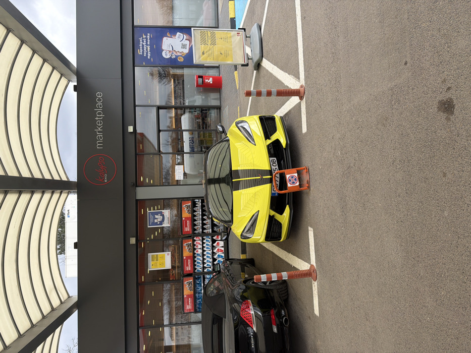 An outdoor scene captures the parking area of an EKO Kalypso marketplace convenience store in Sofia, Bulgaria, identifiable by the "kalypso EKO marketplace" signage, Cyrillic text on displays, and Bulgarian license plates. The sky is overcast. Two vehicles are parked on an asphalt surface marked with white lines. On the left, a black BMW 650i convertible is parked rear-first, with its soft top down. To its right, a bright yellow Chevrolet Corvette C8 is parked front-first, featuring two prominent black racing stripes extending over its hood and roof. The Corvette displays a Bulgarian license plate, "C 7775 OB." Directly in front of the Corvette's bumper, an orange parking barrier, featuring a red circle with a diagonal line (no parking symbol) and Cyrillic text, is present. Two orange-and-white striped traffic cones are also visible on the pavement; one separates the two vehicles, and another stands further right, adjacent to a blue-painted section of a parking space. The store's facade consists of large glass panels, revealing interior shelves stocked with various products, including items labeled "EKO MEGATRON." A red cylindrical trash receptacle is situated near the store entrance. Multiple promotional signs on stands and affixed to windows, displaying Cyrillic text, are also visible. An arched, translucent canopy extends from the building over the parking area. A white truck with "York" branding is partially visible in the distant background above the canopy. No individuals are present in the foreground.