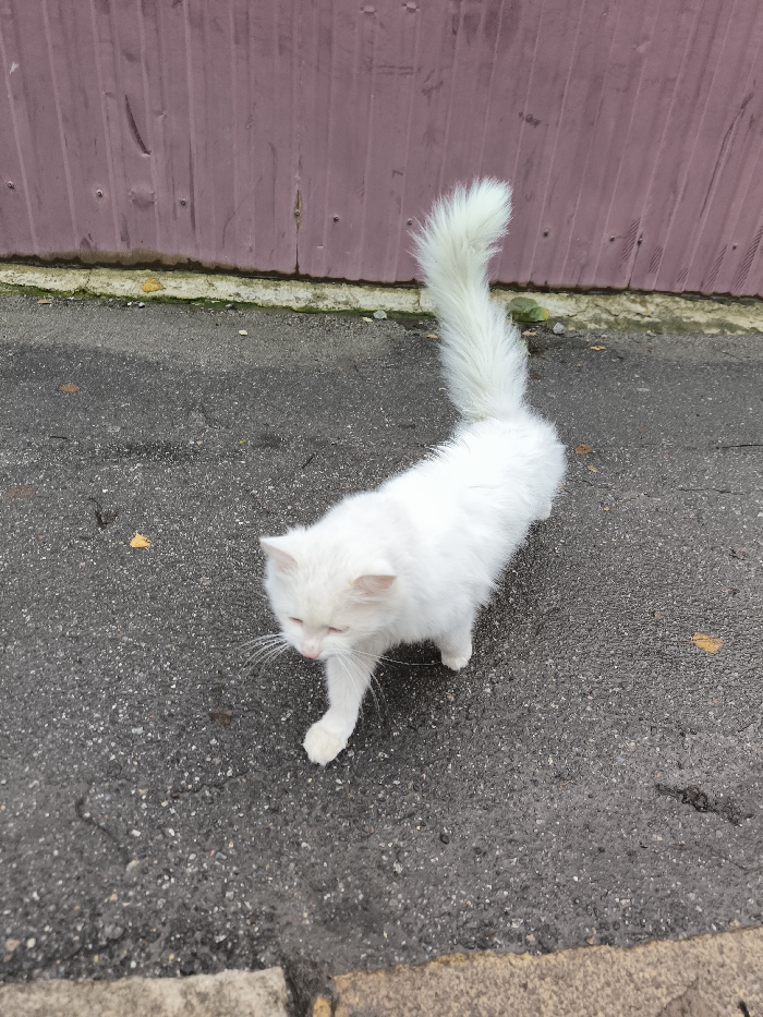 - "A white, long-haired domestic cat walks from the right to the left of the frame across dark grey asphalt pavement in an outdoor setting in Vinnytsia, Ukraine" by FM-dWhzM2, licensed under CC BY 4.0