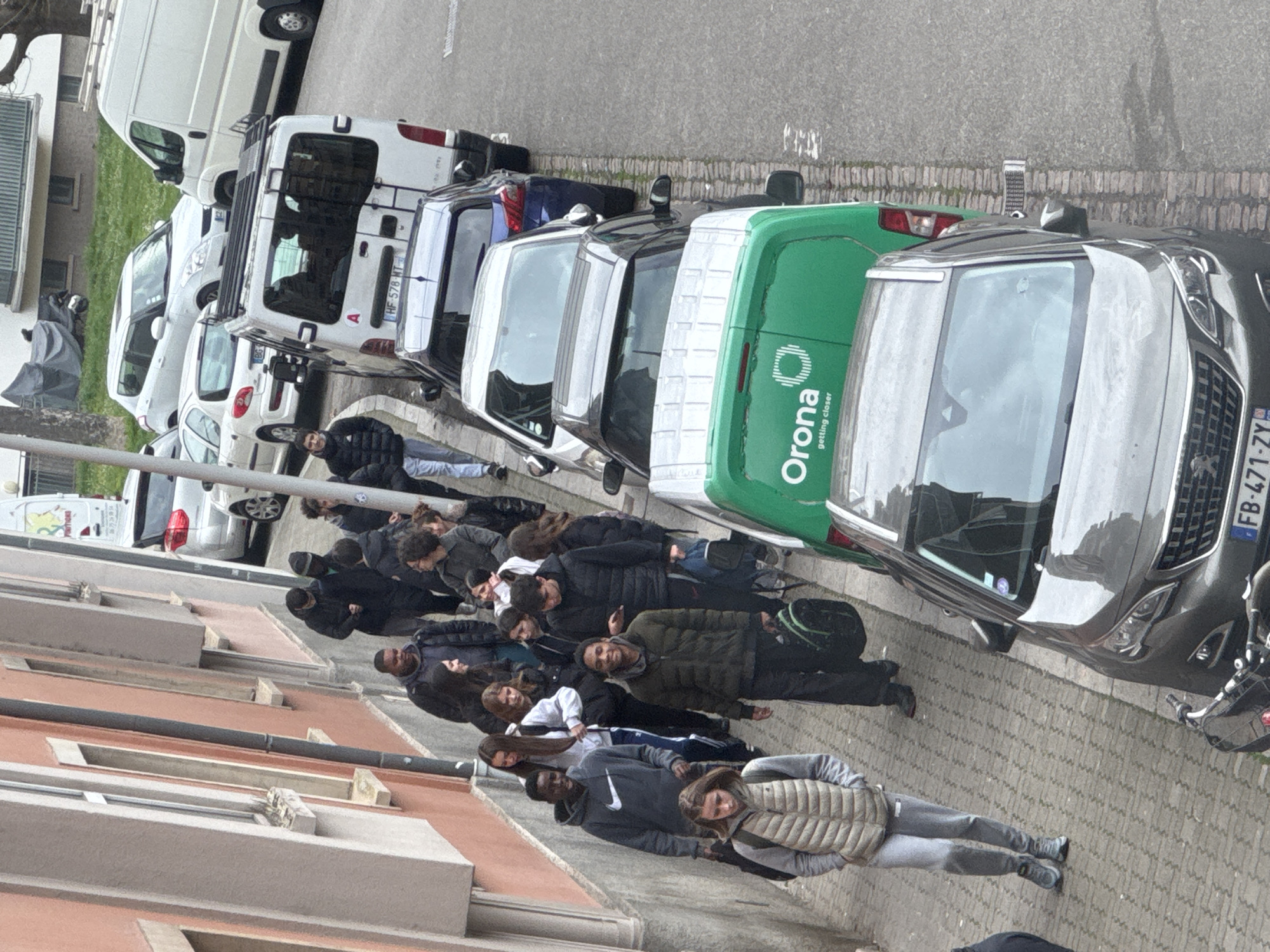 The image depicts an elevated view of a street scene in Strasbourg, France, featuring a group of pedestrians and a line of parked vehicles. Approximately fifteen to twenty young individuals, appearing to be teenagers or young adults, are walking on a cobblestone sidewalk adjacent to a multi-story, salmon-colored building with white window frames and a vertical drainpipe. They are dressed in casual clothing, including puffer vests, hoodies, and jackets, with several carrying backpacks or bags. Parked parallel to the curb on the asphalt street are numerous vehicles. In the immediate foreground, the front of a dark grey Peugeot SUV (license plate FB-471-ZY) is visible. Behind it is a bright green commercial van displaying the "Orona getting closer" logo on its rear. Further down the street, a white van with a roof rack and an "A" sticker (license plate HF-578-HT) is parked, preceded by a blue sedan and a silver car. Additional vehicles include another white van, a silver Suzuki Swift, and a distant white van. A covered motorcycle is parked on a grassy verge beyond the vehicles, near a tree. The environment suggests an urban setting under overcast daylight conditions, as indicated by the lack of distinct shadows. A metal grate is visible in the curb between the sidewalk and the street.