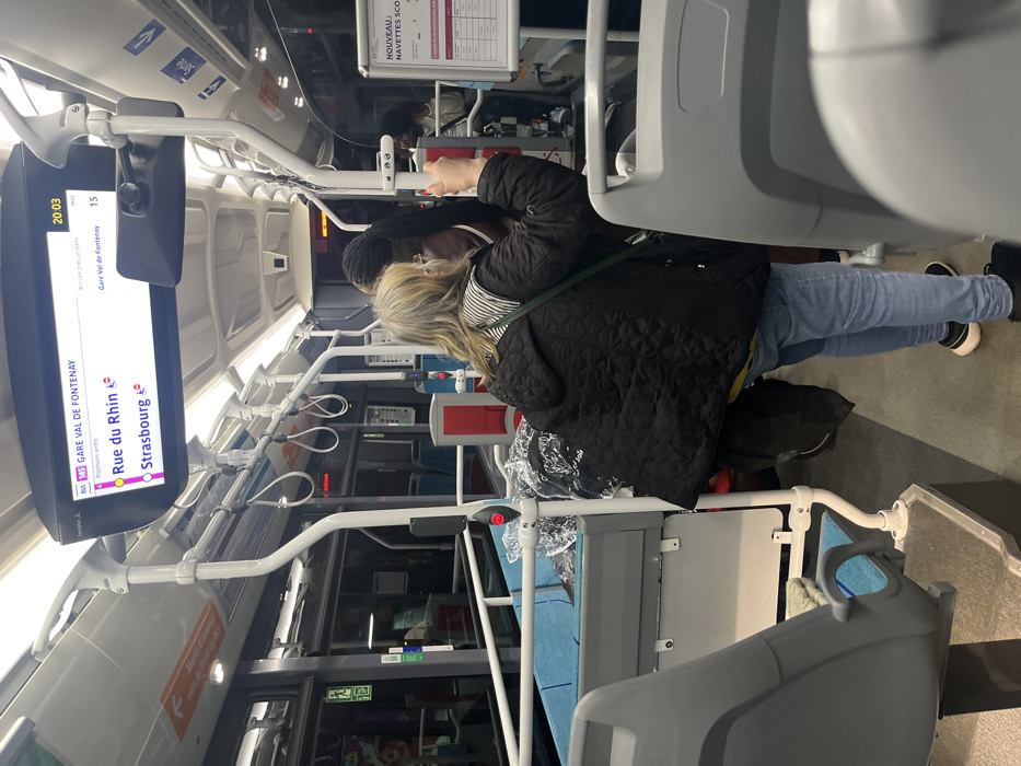 Inside a modern bus, a woman in a quilted jacket and blue jeans stands near a grey seat. An overhead display shows route information: line 86 with upcoming stops at "Rue du Rhin" and "Strasbourg," and the final destination "Gare Val de Fontenay." The current time is 20:03, with an estimated 15-minute arrival time at the destination. A sign about "Nouveau Navettes Sco" is visible above the woman. The bus interior features white handrails and red stop buttons.